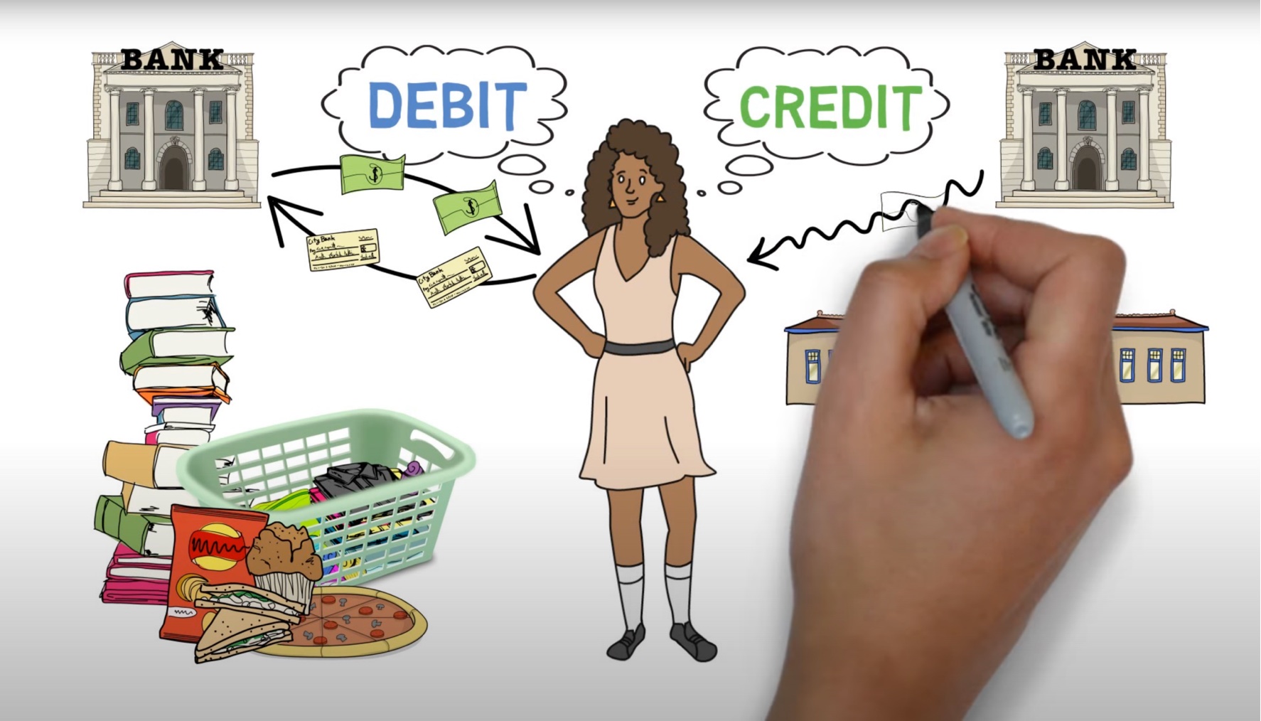 Both debit and credit cards can be used to pay for things without using cash, and both are usually connected to a credit card company, like Visa or Mastercard. But debit cards are connected to your bank account, and they take money directly out of your account when you use the card. Credit cards are loaning you money (whether or not you have money in your bank account at the time), and they charge you interest if you don’t pay it all back on time (usually within 30 days).